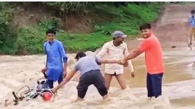 तीन फीट पानी में बह रही थी पुलिया, बाइक सहित परिवार फंसा, लोगों ने किया रेस्क्यू