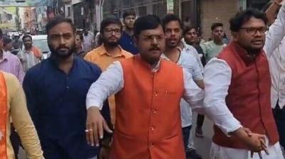नगर निगम पर प्रदर्शन, बैरिकेडिंग के बीच कार्यकर्ताओं ने किया हनुमान चालीसा का पाठ