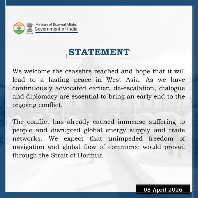 सीजफायर पर भारत की प्रतिक्रिया, अमेरिका-ईरान समझौते का किया स्वागत