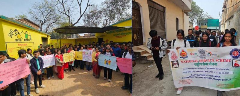 वाराणसी । राजीव गांधी दक्षिणी परिसर, काशी हिंदू विश्वविद्यालय, बरकछा, मिर्ज़ापुर की राष्ट्रीय सेवा योजना (एन.एस.एस.) इकाइयों 011C एवं 011D द्वारा 31 जनवरी 2026 को शाहपुर चौंसा एवं बरकछा ग्रामों में “बाल विवाह मुक्त भारत अभियान” के अंतर्गत एक दिवसीय जागरूकता शिविर का आयोजन किया गया।