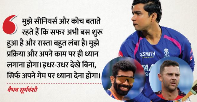 इसके बाद प्रेजेंटर ने उनसे पूछा कि वह बुमराह और हेजलवुड के खिलाफ बिना डर के कैसे खेल लेते हैं? इस पर वैभव ने कहा, 'दिमाग में यह जरूर रहता है कि कौन गेंदबाजी कर रहा है, लेकिन मैं गेंद को खेलने की कोशिश कर रहा होता हूं, गेंदबाज को नहीं देखने की कोशिश करता हूं। गेंद जैसी आती है, उसके अनुसार खेलता हूं और अपना गेम खेलता हूं।' वैभव का यह कहना कि वह बल्लेबाजी के दौरान सिर्फ गेंद को देखते हैं, गेंदबाज को नहीं, उनकी मैच्योरिटी को दर्शाता है।
